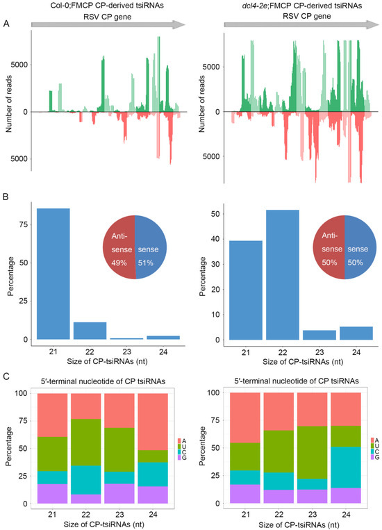 To further decipher the regulatory functions of t-siRNAs, we further compared the canonical 21–24 nt t-siRNAs from the CP transgenic sequence generated from Col-0;FMCP and dcl4-2e;FMCP transgenic plants. The 21–24 nt CP-derived t-siRNA reads were mapped to the CP sequence to explore their origin. As shown in Figure 5A, in Col-0;FMCP plants, the proportions of CP t-siRNAs from both polarities were almost continuous, but some genomic regions exhibited higher mapping frequencies. Similarly, dcl4-2e;FMCP plants also showed a very similar profile of CP t-siRNAs with peaks in the same position, although the t-siRNA peak read number was much higher than that of Col-0;FMCP (Figure 5A). The size distributions of CP t-siRNAs showed that 21 nt was the most dominant size, representing 80% of the total t-siRNAs in Col-0;FMCP plants (Figure 5B). However, in dcl4-2e;FMCP plants, 22 nt and 21 nt were the most dominant sizes, representing 50% and 37% of the total, respectively (Figure 5B). To investigate the origin of CP t-siRNAs, we analyzed the strand specificity and locations of CP t-siRNAs. As shown in Figure 5A,B, Col-0;FMCP and dcl4-2e;FMCP plants both showed similar CP t-siRNA distribution profiles, producing almost equivalent proportions of sense and antisense t-siRNAs. The 5′ terminal nucleotides were characterized for 21–24 nt CP t-siRNAs. The U/A were the most abundant 5′ nucleotides in all four sizes of both Col-0;FMCP and dcl4-2e;FMCP transgenic plants (Figure 5C). The characterization of CP t-siRNAs in CP transgenic Arabidopsis plants with the dcl2-1 or dcl4-2e mutant backgrounds indicates that the accumulation of CP-derived t-siRNAs requires DCL2 but not DCL4, providing evidence that DCL2 plays an essential role in CP-mediated virus resistance.