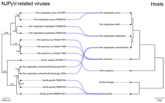 Tanglegram of NJPyV-related viruses and hominine phylogenetic trees. The NJPyV-related virus phylogenetic tree is the MCC tree derived from Bayesian analyses run under an uncalibrated molecular clock model. Branch support is given by posterior probability (numbers above branches). Scales of the NJPyV-related virus and host trees are in substitution per site and million years, respectively.