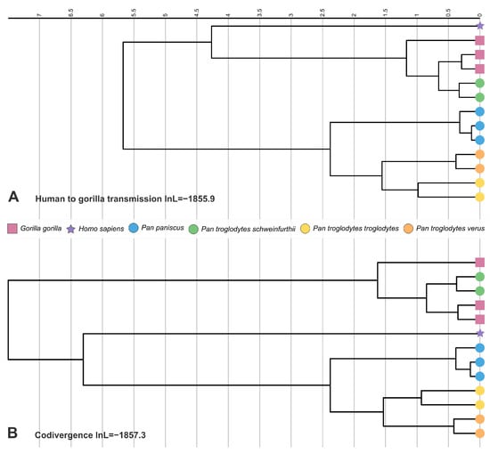 The tanglegram in Figure 1 was generated with the function cophylo of the package phytools in R v4.3.1 [27,28]. Dates for the host phylogeny were derived from Timetree [29], except for dates within Pan troglodytes, which were derived from [30]. We did not use Timetree-derived dates for formal calibration as these are aggregate dates that may not all originate in the same original studies. The phylogenetic trees in Figure 2 were prepared with iTol v5 [31].