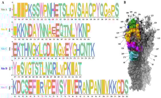 The evasion of influenza A viruses from the host immune system is mainly mediated through its surface protein HA. During the past decade, the clade 2.3.4.4 viruses have undergone extensive genetic and antigenic evolution, resulting in the formation of eight subclades (clade 2.3.4.4a–h). Antigenic variations have been observed between different clades and even within the same clade [14,15,16,21]. However, the specific antigenic epitopes driving the antigenic diversity of clade 2.3.4.4 viruses remain unclear. To gain a comprehensive understanding of the antigenic epitopes of H5 viruses carrying clade 2.3.4.4 HA, we mapped the 3D structure of H5 HA to the five antigenic epitope regions (A–E) of human H3N2 viruses [28,29] (Figure 1B). By analyzing a total of 5713 HA sequences downloaded from the database using a method previously described [31,35], we inferred that antigenic region A exhibited the highest frequency of amino acid change, with eight potential antigenic positions (i.e., 115, 119, 120, 123, 126, 129, 140, and 141, Figure 1A). For antigenic region B, six possible antigenic positions (151, 156, 183, 185, 188, and 189) were identified, and for antigenic region C, three potential antigenic positions (40, 269, and 273) were identified. At antigenic region D, there were two possible antigenic positions (198 and 210), and at antigenic region E, there were four potential antigenic positions (72, 83, 257, and 259). In summary, a thorough analysis of amino acid polymorphisms across the five antigenic regions identified 22 potential antigenic positions.
