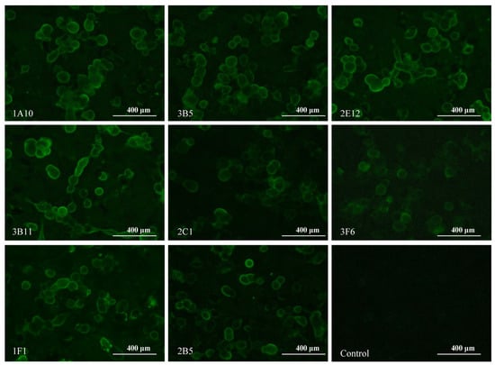 Monoclonal antibodies (mAbs), a crucial tool for distinguishing subtle differences between antigens, have been extensively employed to map antigenic epitopes of HA proteins in various studies [41,42,43,44,45]. To elucidate the antigenic epitopes of H5-HA, we generated a panel of eight mAbs by immunizing mice with H5-Re8 HA. The successful selection of hybridoma cell lines was validated using the hemagglutination inhibition assay (HI). As shown in Table 2, the eight mAbs, designated as 2C1, 1A10, 2E12, 2B5, 3F6, 3B11, 1F1, and 3B5, effectively inhibited the interaction between the H5-Re8 virus and chicken erythrocytes, exhibiting HI titers ranging from 128 to 256. We first tested the specificity of the eight mAbs to H5-Re8 HA by performing an indirect immunofluorescence assay (IFA) in cells transfected with a plasmid expressing the H5-Re8 HA protein. All eight mAb-treated cells displayed enhanced fluorescence, whereas the mock-treated cells did not, indicating that the eight mAbs have a high binding affinity for H5-Re8 HA (Figure 3). We then determined the isotypes of the eight mAbs by using an isotyping test kit. The mAbs were categorized into three distinct IgG subclasses: 2C1 was classified as IgM; 1A10 and 2E12 were classified as IgG2a; and the remaining five mAbs (i.e., 2B5, 3F6, 3B11, 1F1, and 3B5) were classified as IgG2b (Table 2). All the mAbs possessed κ light chains. Lastly, we tested the effect of the eight mAbs on H5-Re8 replication by using a microneutralization assay (MN). The results showed that all eight mAbs neutralized H5-Re8 replication at a concentration of 40 µg/mL (Table 2). These results demonstrate that all eight mAbs specifically recognize H5-Re8 HA and have inhibitory activity against the H5-Re8 virus.