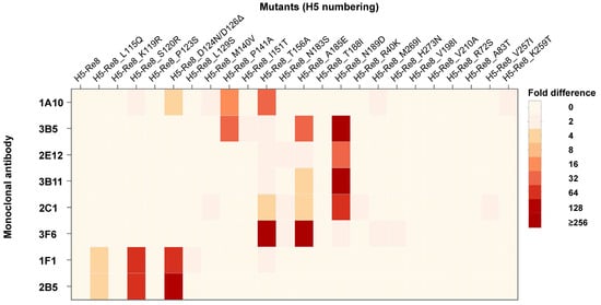 Antigenic heatmap of H5-Re8 mutants. The antigenicity of H5-Re8 variants was determined by quantifying hemagglutination inhibition (HI) titers using a panel of eight monoclonal antibodies (mAbs) developed in this study. An antigenicity difference is considered significant when there is a 4-fold difference.