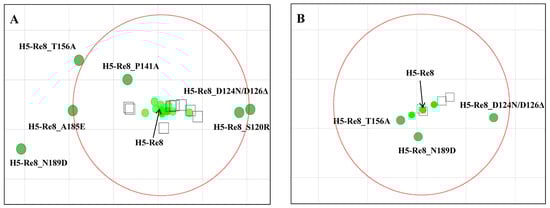To better depict the antigenic differences among the mutants, HI titers were converted into an antigenic map using a previously described algorithm [34,46]. In the antigenic map constructed using data derived from the mAbs, four mutants—H5-Re8_D124N/D126Δ, H5-Re8_T156A, H5-Re8_A185E, and H5-Re8_N189D—showed significant antigenic differences from the H5-Re8 virus. H5-Re8_S120R and H5-Re8_P141A exhibited antigenic differences, although the differences were not significant (Figure 5A). Compared with the mAbs, the polyclonal antisera distinguished a limited number of antigenic sites (Figure 5B). Specifically, H5-Re8_D124N/D126Δ showed a notable antigenic difference from H5-Re8, whereas H5-Re8_T156A showed a less significant difference. Notably, although not identified with the polyclonal antisera, H5-Re8_N189D exhibited an antigenic difference from H5-Re8 in the map, but this difference was not significant. In summary, our data revealed that positions 120, 126, 141, 156, 185, and 189 are the primary antigenic positions for the clade 2.3.4.4 H5 viruses, with positions 126, 185, and 189 having a predominant impact on the antigenicity of H5 viruses.