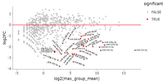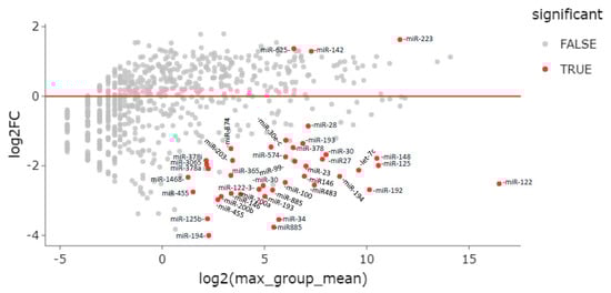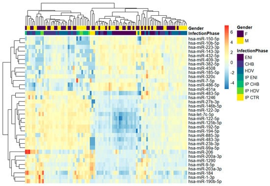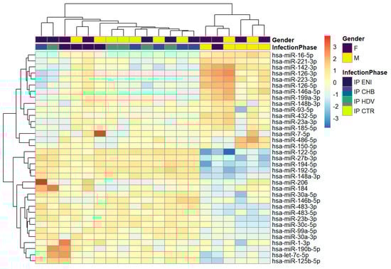 In total, 42 miRNAs were differentially expressed between ENI vs. CHB patients—39 downregulated and 3 upregulated (miR-625-3p, miR-142-5p, and miR-223-3p) in ENI (Table 2, Figure 3).