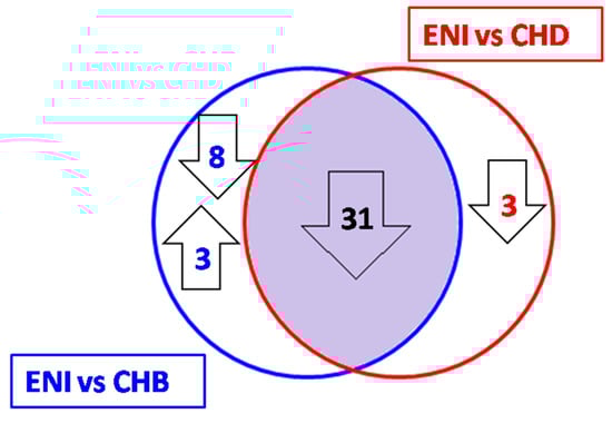 Eight of the 39 miRNAs that were downregulated in ENI vs. CHB did not show significant differential expression when comparing ENI with CHD patients (Table 5 and Figure 5).