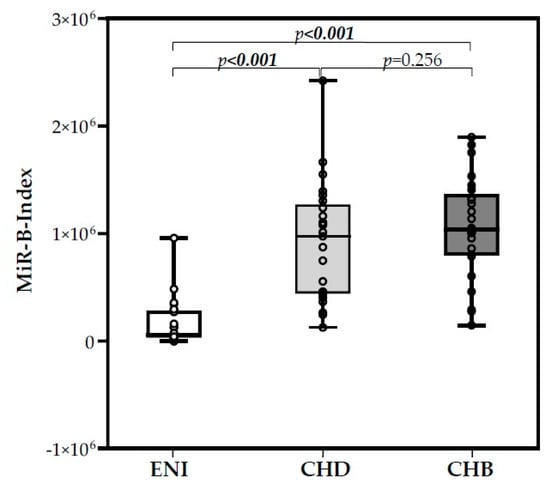 The expression levels of six miRNAs, three hepatocellular miRNAs (miR-122-5p, miR-99a-5p, miR-192-5p), and three control miRNAs (miR-126-3p, miR-335-5p, and miR-320a) were used to calculate the MiR-B-Index, as previously reported [23]. The mean MiR-B-Index value for ENI was 1.67 × 105, that for CHB was 1.06 × 106, and that for CHD was 9.10 × 105 (Kruskal–Wallis, p < 0.001). MiR-B-Index values were comparable between CHB and CHD patients (Mann–Whitney, p = 0.256), whereas they were significantly different between CHB and ENI (Mann–Whitney, p < 0.001) and between CHD and ENI (Mann–Whitney, p < 0.001). The distribution of MiR-B-Index values in the three groups is reported in Figure 6.