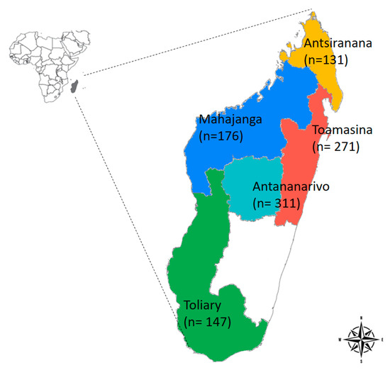 Location of sample collection sites. The figure shows the map of Madagascar, with Africa in perspective. Samples were collected in five of the six provinces of Madagascar. The numbers in parentheses represent the sample size from each of the five provinces.