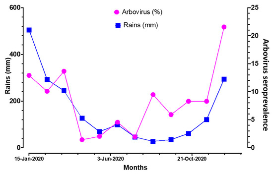 Variation in seroprevalence of antibodies against arboviruses in Madagascar over time. The left axis (blue squares) represents the average rainfall (in millimeters), and the right axis (pink circles) represents the seroprevalence of IgG antibodies against arboviruses (in percentage). The horizontal axis represents the months of sampling averaged over the four years of the study period. A significant correlation was observed between rainfall and seroprevalence (Pearson, r = 0.61, p = 0.036).