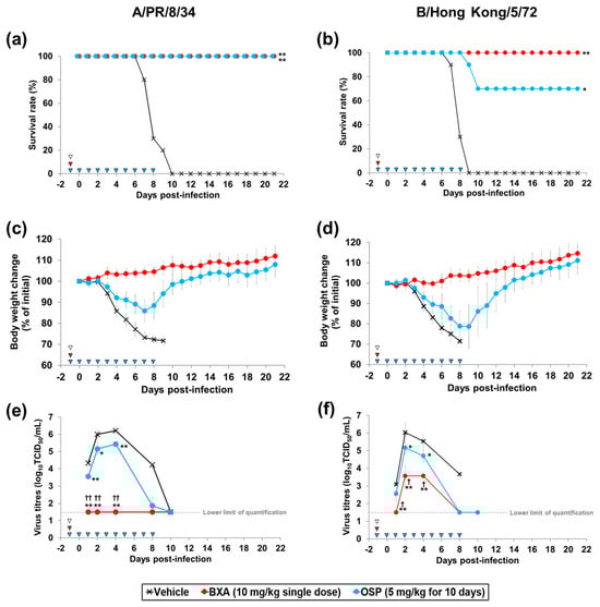 Effect of prophylactic treatment with baloxavir acid and oseltamivir phosphate on mortality, body weight loss and lung virus titre in mice infected with influenza A or B virus. Ten mice were subcutaneously administered baloxavir acid (BXA) or vehicle 24 h before infection. As a reference, from 24 h before infection, mice were orally administered oseltamivir phosphate (OSP) once a day for 10 days. The mice were then intranasally inoculated with A/PR/8/34 (H1N1) or B/Hong Hong/5/72 strain at 24 h after the initial dosing. Survival (a,b) and body weight (c,d) were monitored daily for 21 days after the virus infection. Lung virus titres were measured at 1, 2, 4, 8 and 10 days after infection (e,f). Triangles indicate the time points of administration of each compound. Survival times among the three groups were analysed by log-rank test. For the pairwise comparison of the virus titres in lungs between two groups at each time point, the one-way analysis of variance model was applied by time point. * and ** denote p < 0.05 and p < 0.0001 vs. the vehicle group. † and †† denote p < 0.05 and p < 0.0001 vs. OSP group.