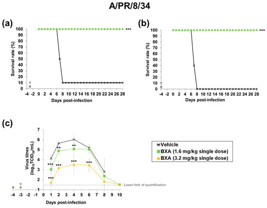 Effect of baloxavir acid at each administration timing and dosage on mortality and lung virus titre in mice infected with influenza A virus. Ten mice were subcutaneously administered baloxavir acid (BXA) or vehicle at 72 or 96 h before infection. The mice were then intranasally inoculated with A/PR/8/34 (H1N1) strain at 72 or 96 h after dosing. Survival and body weight were monitored daily for 28 days after the virus infection (a,b). Viral titres in supernatants of lung homogenates were determined (n = 10 per group) on days 1, 2, 4, 6, 8 and 10 after infection by standard TCID50 assay (c). Triangles indicate the time points of administration of each compound. Survival times among the three groups were analysed by log-rank test. For the pairwise comparison of the virus titres in lungs between two groups each at each time point, the one-way analysis of variance model was applied by time point. ** and *** denote p < 0.01 and p < 0.0001 vs. the vehicle group, respectively.