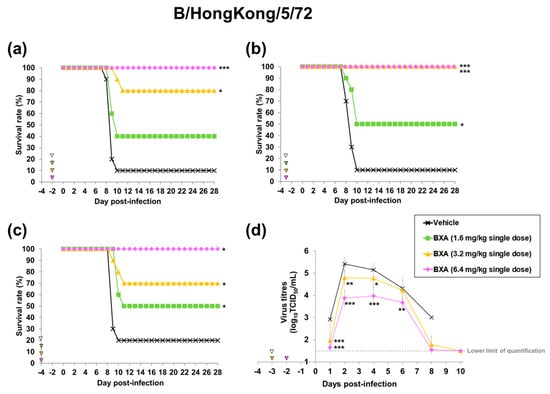 On the other hand, in the B/Hong Kong/5/72-infected mouse model, when baloxavir acid was administered at 48 or 72 h before infection, all mice survived in the group given 6.4 mg/kg of baloxavir acid. At the dose of 3.2 mg/kg, baloxavir acid also significantly improved survival when administered at 48, 72 or 96 h before infection, whereas the survival rate in the group given 1.6 mg/kg of baloxavir acid was 50% at most (Table 1, Figure 4a–c).