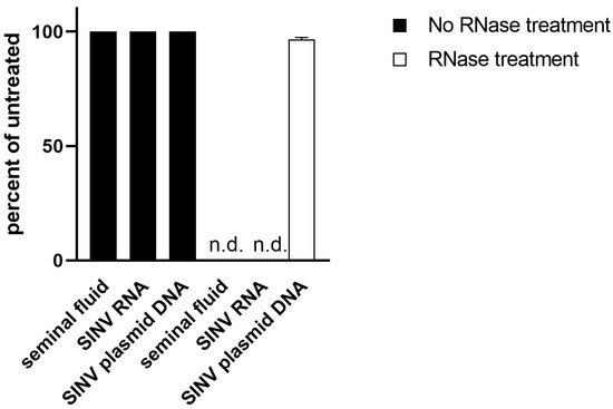 Analysis of viral material. Nucleic acid from semen was isolated and left untreated (black) or subjected to RNase treatment (white). SNV RNA and a plasmid (not sensitive to RNase treatment) containing the target of the SNV RT-qPCR served as controls. After RNase digestion, no signal could be detected in material derived from semen or control RNA (n.d.; not detected).
