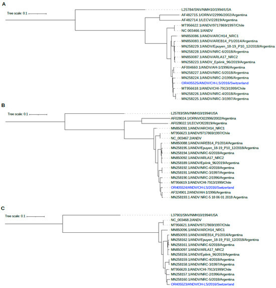 Phylogenetic analysis of ANDV shows a close relationship to previously sequenced ANDV from Chile and Argentina ((A): segment S, (B): segment M, (C): segment L).