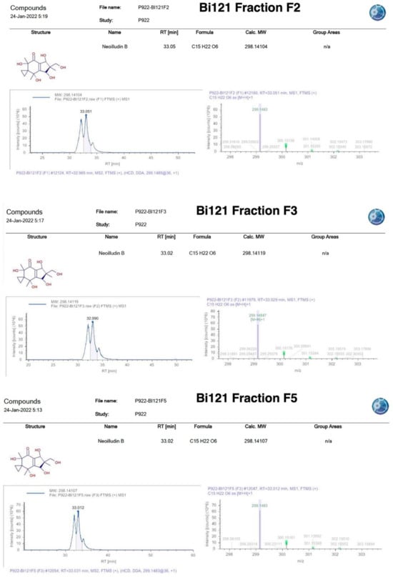 Neoilludin B—LC–MS putative identification from Bi121 fractions (F2, F3, F5).