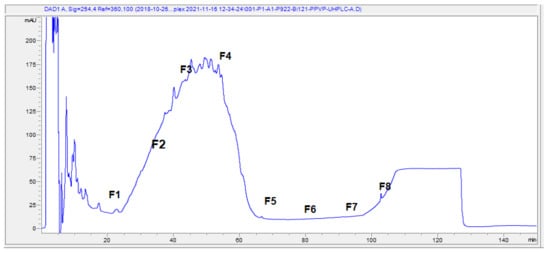 Preparation of polyphenol fractions of Bi121 by reversed-phase UHPLC. Fractionation of the polyphenol-enriched fraction was carried out using an Agilent AdvanceBio Column (2.7 µm, 2.1 × 250 mm) with solvent A (10 mM TEABC, pH 8.0) and an Agilent UHPLC 1290 system. The separation was performed by running a gradient of solvent B (10 mM TEABC, pH 8.0, 90% ACN) and solvent A (10 mM TEABC, pH 8.0) at a flow rate of 250 µL/min. The elute fractions were collected into a 96-well plate using a 1260 series auto-sample fraction collector based on the peaks at UV wavelengths between 214 nm and 280 nm. The 96-well plate elute fractions were collected into 1.5 mL tubes according to retention time (12 min per fraction) for a total of 8 fractions, as shown in the LC chromatography. Six UHPLC runs were performed, and the eight fractions were pooled and further evaporated using a speed vacuum.