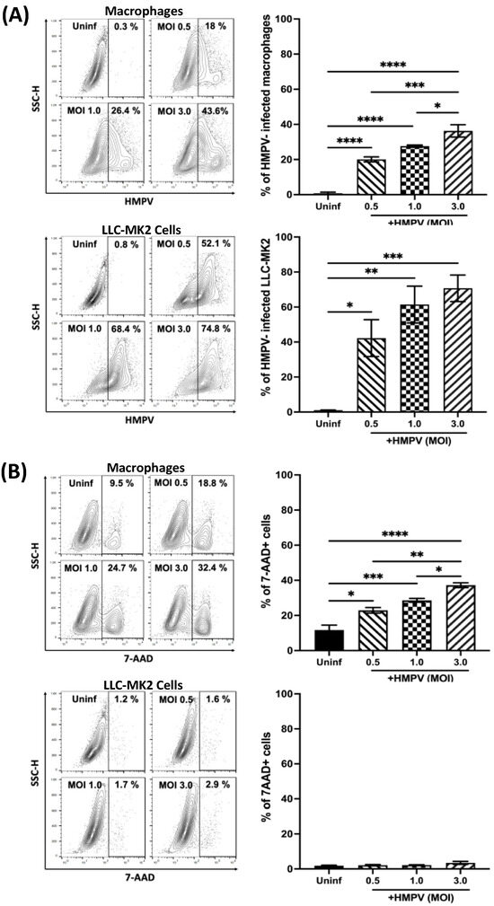 To define the optimal conditions for infecting macrophages with HMPV that could provide the maximum infectivity with the least cell damage, the percentage of dead cells after HMPV infection was determined in the same culture conditions as in Figure 1A. Cell death was assessed by 7-AAD staining followed by flow cytometry analysis. As shown in the bar graphs of Figure 1B, uninfected macrophages showed a percentage of 7-AAD positive cells of 11.4 ± 2.9%, while macrophages infected at an MOI of 3.0 exhibited the highest level of cell death (36.2 ± 2.1%). Cells infected at MOIs of 5.0 and 10.0 induced 42% and 43.4% cell mortality, respectively [29]. However, no significant difference between macrophages infected at an MOI of 0.5 (22.5 ± 1.9%) or 1.0 (27.8 ± 1.2%) was observed. On the other hand, the cell viability was minimally compromised in uninfected LLC-MK2 cells (1.6 ± 0.2%), which was marginally increased after HMPV infection at any of the tested MOIs to about 3%. The quantile contour plots show representative data analyses from each cell type. Overall, the combined viral infection and cell death experiments allowed us to determine that the best condition to infect macrophages with HMPV used the MOI of 1.0, which resulted in significant levels of HMPV-infected cells without the maximum cell mortality.