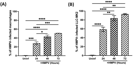 Susceptibility of macrophages to HMPV infection at different time points. (A) THP-1-derived macrophages were infected with HMPV at MOI 1.0. (B) LLC-MK2 cells were included as permissive reference cells. The percentage of infected cells was determined by the expression of HMPV P protein at different time points. All samples were analyzed by flow cytometry and Flow Jo V10.9. Graph bars represent the mean of 3 independent experiments ± SEM. Statistical differences were calculated using ANOVA followed by a post hoc Tukey´s multiple comparison test. * p < 0.05, ** p < 0.01, *** p ≤ 0.001, **** p ≤ 0.0001.