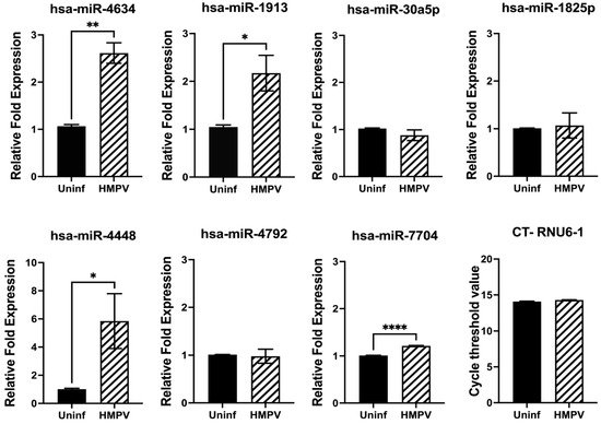 The overexpression of hsa-miR-1913 was also associated with multiple forms of cancer [44,45,46,47,48,49], similar to hsa-miR-7704 [50,51,52]. However, the role of these miRNAs in HMPV infection warrants additional research.