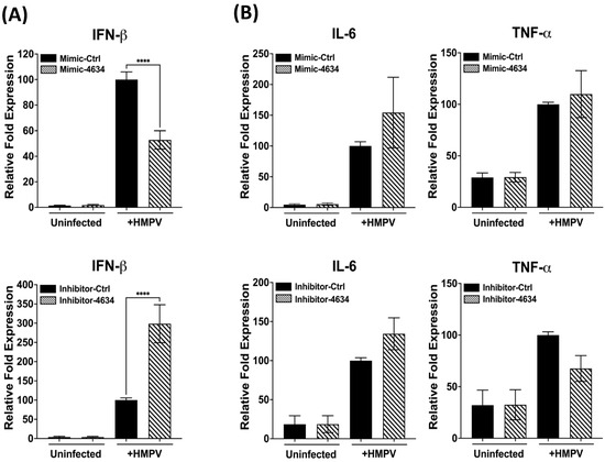 Based on the predominant expression of hsa-miR-4634 by HMPV (Figure 3), the function of this miRNA on the macrophage immunity in response to HMPV infection was investigated by using a mimic or inhibitor for hsa-miR-4634. The miR-4634 inhibitor (herein referred to as inhibitor-4634) is a single-stranded RNA molecule specific to inhibiting the function of hsa-miR-4634 by hybridizing with endogenous and mature hsa-miR-4634. At the same time, the miR-4634 mimic is a chemically modified RNA duplex that mimics the function of the endogenous hsa-miR-4634 (herein referred to as mimic-4634). The corresponding negative controls for either mimic-4634 or inhibitor-4634 are inert and do not modulate any genes after transfection into the cells. THP-1-derived macrophages were transfected with either a mimic or an inhibitor. After 24 h, cells were infected with HMPV at an MOI of 1.0 for 24 h. The expression of IFN-α2, IFN-β, and proinflammatory cytokines (IL-6 and TNF-α) was assessed by RT-qPCR. The data shown in Figure 4A (upper panel) indicate that adding hsa-miR-4634 (mimic) decreased HMPV-induced IFN expression. That effect was reversed in the presence of hsa-miR-4634 inhibitor (lower panel), where an increase in IFN-β expression was observed in the presence of hsa-miR-4634 inhibitor. The expression of IFN-α2 by HMPV infection in macrophages was not induced [30]. Furthermore, when assessing the effect of hsa-miR-4634 on the expression of proinflammatory cytokines IL-6 and TNF-α, no significant changes caused by the hsa-miR-4634 mimic or inhibitor were observed, as shown in Figure 4B. Overall, these data suggest that hsa-miR-4634 regulates type I IFN response in macrophages.