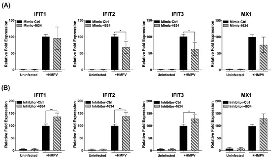 Effect of hsa-miR-4634 on interferon-stimulated genes in macrophages. THP-1-derived macrophages were transfected by electroporation with (A) hsa-miR-4634 mimic (100 nM) or (B) inhibitor (50 nM) (see Methods). After 24 h of culture, macrophages were infected with HMPV at an MOI of 1.0 for 24 h. Total RNA was extracted to assess gene expression of IFIT1, IFIT2, IFIT3, and MX1 by using RT-qPCR. Graph bars represent the mean of four independent experiments ± SEM. Statistical differences between infected and uninfected cells were calculated using ANOVA, followed by Sidak’s multiple comparison test. * p < 0.05; ** p < 0.01.
