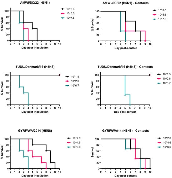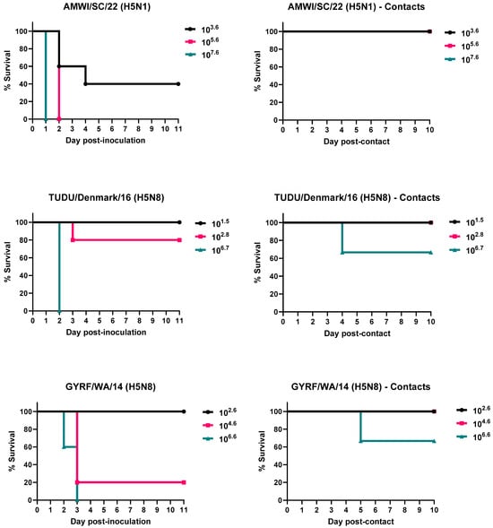 Survival curves of chickens inoculated with the H5 HPAIVs and the contact-exposed birds. Birds received low, medium, and high doses of the viruses. Contact-exposed birds were added to isolators one day post-inoculation.