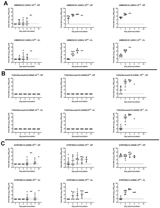 Virus shedding for chickens inoculated with different doses of the H5 HPAIVs: (A) AMWI/SC/21; (B) TUDU/Denmark/16; (C) GYRF/WA/14. Virus titers from oropharyngeal (OP) and cloacal (CL) swabs were determined by qRT-PCR. The dotted lines indicate the limit of detection for each virus.