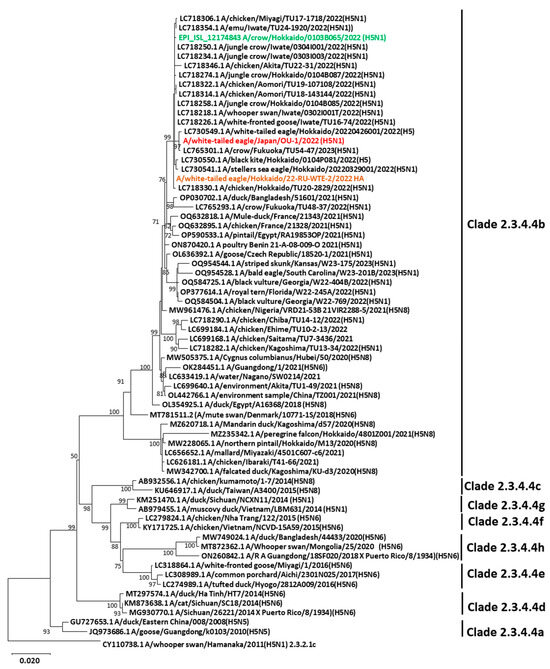 - Isoda, N.; Onuma, M.; Hiono, T.; Sobolev, I.; Lim, H.Y.; Nabeshima, K.; Honjyo, H.; Yokoyama, M.; Shestopalov, A.; Sakoda, Y. Detection of new H5N1 high pathogenicity avian influenza viruses in winter 2021–2022 in the far east, which are genetically close to those in Europe. Viruses 2022, 14, 2168. [Google Scholar] [CrossRef]