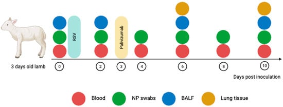 Study design and sampling timeline using an RSV lamb model. Neonatal lambs were infected with the RSV-A2 strain intranasally on day 0. Nasopharyngeal (NP) swabs, blood, and bronchoalveolar lavage fluid (BALF) were collected at baseline (day 0) and then on day 2, 4, 6, 8 and 10 post-inoculation. Lambs were euthanised either on day 6 (peak infection) or day 10 (recovery) post-inoculation according to the study group (refer to Table 1). Image was created using BioRender.com.