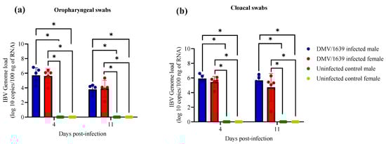 The IBV genome was not detected in OP and CL swabs from uninfected male and female chickens at 4 and 11 dpi, while it was detected in the IBV-challenged chickens (Figure 1). A statistically significant difference in IBV genome load was not observed between the infected male and female chickens in the viral shedding via OP and CL swabs at 4 and 11 dpi (Figure 1, p > 0.05).