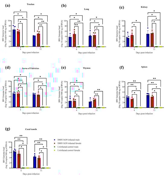 IBV genome loads in (a) trachea, (b) lung, (c) kidney, (d) bursa of Fabricius, (e) thymus, (f) spleen, and (g) cecal tonsils at 4 and 11 dpi following challenge with the Canadian DMV/1639 strain of IBV. The average starting IBV genome load was quantified per 100 ng of the extracted RNA, and a comparison between groups was performed using the Kruskal–Wallis test followed by Dunn’s multiple comparisons test. The error bars represent the SD. Statistical significance: * p < 0.05, ** p < 0.01.