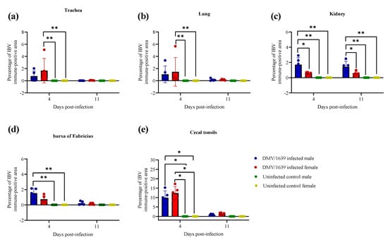 Percentage of IBV immune-positive area for IBV nucleoprotein in the (a) trachea, (b) lung, (c) kidney, (d) bursa of Fabricius, and (e) cecal tonsils at 4 and 11 dpi following challenge with the Canadian DMV/1639 strain of IBV. The comparison between groups was performed using the Kruskal–Wallis test followed by the Dunn’s multiple comparisons test, and the error bars represent the SD. Statistical significance: * p < 0.05 and ** p < 0.01.