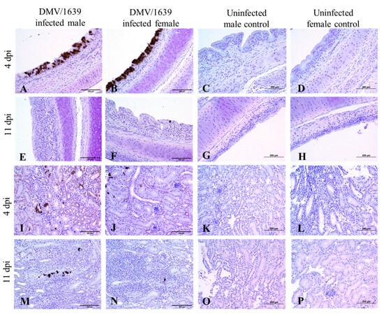 Photomicrograph of IBV nucleoprotein in the trachea and kidney. (A–D) Trachea of IBV DMV/1639-infected male, IBV DMV/1639-infected female, uninfected control male, and uninfected control female chickens at 4 dpi, respectively. (E–H) Trachea of IBV DMV/1639-infected male, IBV DMV/1639-infected female, uninfected control male, and uninfected control female chickens at 11 dpi, respectively. (I–L) Kidney of IBV DMV/1639-infected male, IBV DMV/1639-infected female, uninfected control male, and uninfected control female chickens at 4 dpi, respectively. (M–P) Kidney of IBV DMV/1639-infected male, IBV DMV/1639-infected female, uninfected control male, and uninfected control female chickens at 11 dpi, respectively.