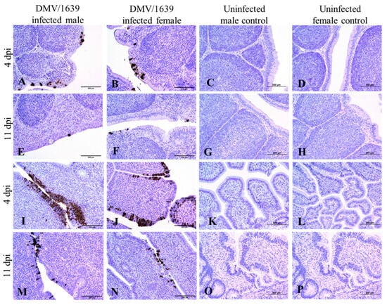 Photomicrograph of IBV nucleoprotein in the bursa of Fabricius and cecal tonsils. (A–D) bursa of Fabricius of IBV DMV/1639-infected male, IBV DMV/1639-infected female, uninfected control male, and uninfected control female chickens at 4 dpi, respectively. (E–H) bursa of Fabricius of IBV DMV/1639-infected male, IBV DMV/1639-infected female, uninfected control male, and uninfected control female chickens at 11 dpi, respectively. (I–L) Cecal tonsils of IBV DMV/1639-infected male, IBV DMV/1639-infected female, uninfected control male, and uninfected control female chickens at 4 dpi, respectively. (M–P) Cecal tonsils of IBV DMV/1639-infected male, IBV DMV/1639-infected female, uninfected control male, and uninfected control female chickens at 11 dpi, respectively.