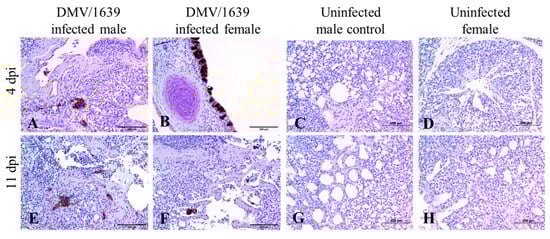 Photomicrograph of IBV nucleoprotein in the lung. (A–D) The lungs of IBV DMV/1639-infected male, IBV DMV/1639-infected female, uninfected control male, and uninfected control female chickens at 4 dpi, respectively. (E–H) The lungs of IBV DMV/1639-infected male, IBV DMV/1639-infected female, uninfected control male, and uninfected control female chickens at 11 dpi, respectively. The 4 dpi lung section of a female DMV1639-infected chicken shows a primary bronchus within lung tissue.
