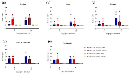 Lesion scores in the (a) trachea, (b) lung, (c) kidney, (d) bursa of Fabricius, and (e) cecal tonsils at 4 and 11 dpi following challenge with the Canadian IBV DMV/1639 strain. The comparison between groups was performed using the Kruskal–Wallis test followed by Dunn’s multiple comparisons test, and the error bars represent the SD.
