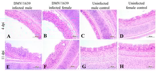 Photomicrographs of the trachea of (A) an IBV DMV/1639-infected male chicken at 4 dpi, (B) an IBV DMV/1639-infected female chicken at 4 dpi showing loss of cilia, degeneration, and necrosis of the epithelial lining, and mucosal and submucosal inflammatory cell infiltration, (C) an uninfected control male chicken at 4 dpi, and (D) an uninfected control female chicken at 4 dpi showing a normal histological picture, (E) an IBV DMV/1639-infected male at 11 dpi showing hyperplasia of the epithelial lining and focal area of epithelial necrosis with mucosal mononuclear cell aggregation, (F) an IBV DMV/1639-infected female chicken at 11 dpi showing focal epithelial loss with mucosal mononuclear inflammatory cell infiltration, (G) an uninfected control male chicken at 11 dpi, and (H) an uninfected control female chicken at 11 dpi.