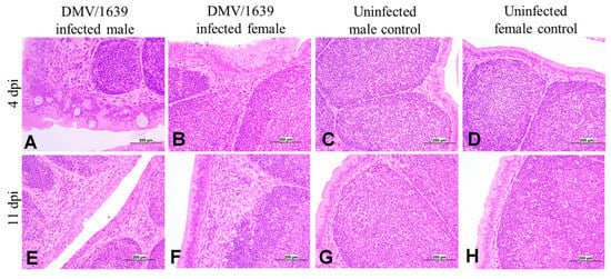 Photomicrograph of the cecal tonsils of (A) an IBV DMV/1639-infected male chicken at 4 dpi showing degeneration and necrosis of lining epithelium with vacuolation of sub-epithelial mononuclear cells, (B) an IBV DMV/1639-infected female chicken at 4 dpi showing mild degeneration of the epithelium, (C) an uninfected control male at 4 dpi, (D) an uninfected control female chicken at 4 dpi showing normal epithelial lining and lymphoid follicles, (E) an IBV DMV/1639-infected male chicken at 11 dpi, (F) an IBV DMV/1639 infected female chicken at 11 dpi show mild epithelial degeneration and necrosis, (G) an uninfected control male chicken at 11 dpi, and (H) an uninfected control female at 11 dpi.