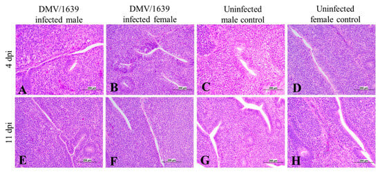 Photomicrographs of the kidney of (A) an IBV DMV/1639-infected male chicken at 4 dpi, (B) an IBV DMV/1639-infected female chicken at 4 dpi showing focal interstitial nephritis, (C) an uninfected control male chicken at 4 dpi, (D) an uninfected control female chicken at 4 dpi showing a normal histological architecture, (E) an IBV DMV/1639-infected male chicken at 11 dpi, (F) an IBV DMV/1639-infected female chicken at 11 dpi showing diffuse lymphoplasmocytic interstitial nephritis, (G) an uninfected control male chicken at 11 dpi, and (H) uninfected control female chicken at 11 dpi.