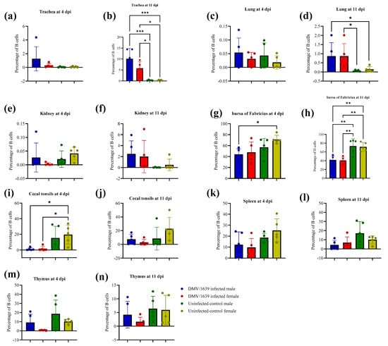 Percentage of B (BU-1+) cells in tissues infected with Canadian IBV DMV/1639 strain in male and female chickens and uninfected control male and female chickens at 4 and 11 dpi. (a,b) trachea, (c,d) lung, (e,f) kidney, (g,h) bursa of Fabricius, (i,j) cecal tonsils, (k,l) spleen and (m,n) thymus. The comparison between groups was performed using one-way ANOVA followed by Turkey’s multiple comparisons test, and the error bars represent the SD. Statistical significance: * p < 0.05, ** p < 0.01 and *** p < 0.001.