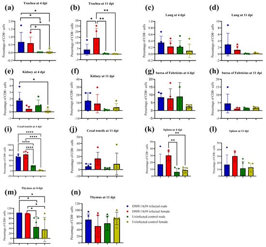 Percentage of T (CD8+) cells in tissues infected with the Canadian IBV DMV/1639 strain in male and female chickens and uninfected control male and female chickens at 4 and 11 dpi: (a,b) trachea, (c,d) lung, (e,f) kidney, (g,h) bursa of Fabricius, (i,j) cecal tonsils, (k,l) spleen, and (m,n) thymus. The comparison between groups was performed using one-way ANOVA followed by Turkey’s multiple comparisons test, and the error bars represent the SD. Statistical significance: * p < 0.05, ** p < 0.01, and **** p < 0.0001.