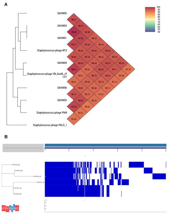 Whole-genome analysis. (A) Phylogenetic tree based on whole-genome sequence analysis of the six isolated phages and most representative similar genomes recovered from NCBI GenBank database (accessed on 2 November 2022). Scale represents the percentage of nucleotide identity. (B) Pangenome analysis of the six isolated phage genomes. CDS regions of SAVM01 are very similar to those of SAVM03 and present a lower similarity level to those of SAVM02, confirming the phylogenetic analysis results. SAVM04, SAVM05 and SAVM06 display different CDS profiles, explaining the genetic distance observed with other phages.