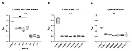 Phage control of a 24 h biofilm quantified using crystal violet staining method (A550 nm). (A) S. aureus NSA1385 biofilm was treated by SAVM01 at various concentrations (101-107 PFU/mL) and incubated for another 24 h at 37 °C to determine the optimal phage concentration. (B) S. aureus NSA1385 and (C) S. pettenkoferi P003 biofilms were treated with SAVM01-SAVM06 phages at 107 PFU/mL and incubated for another 24 h at 37 °C. For the control, biofilms were treated with SM buffer. Each box plot represents the mean ± SD of five replicates. **, p < 0.01; ****, p < 0.0001 (ordinary one-way ANOVA test).