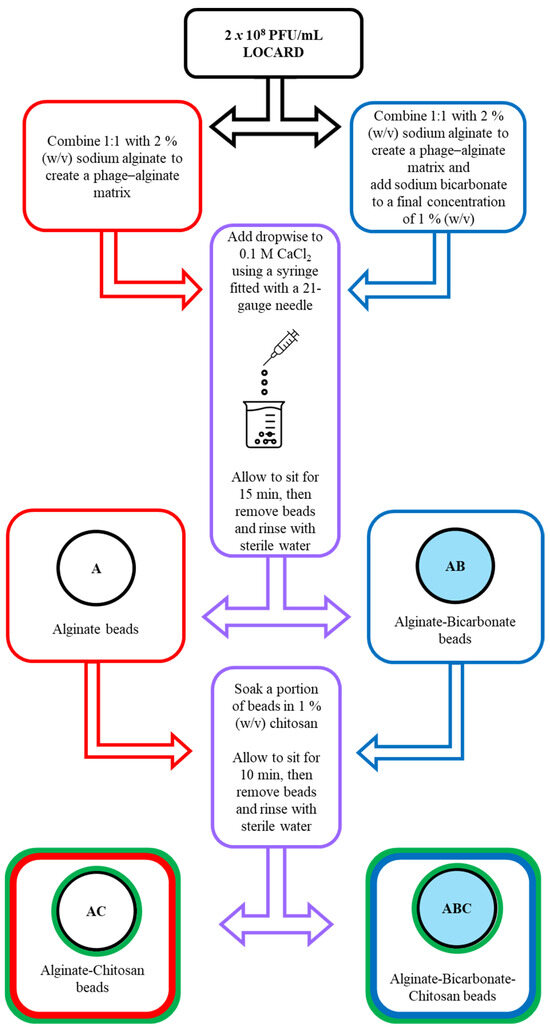 Flow chart describing the phage encapsulation process. LOCARD particles adjusted to 2 × 108 PFU/mL are added to 2% sodium alginate. To a portion of this mixture, sodium bicarbonate is added to a final concentration of 1%. Both versions of the matrix are added dropwise to 0.1 M CaCl2 through a 21-gauge needle, resulting in alginate (A) and alginate-bicarbonate (AB) beads. A portion of A and AB beads are further treated with 1% chitosan to create alginate-chitosan (AC) and alginate-bicarbonate-chitosan (ABC) beads.