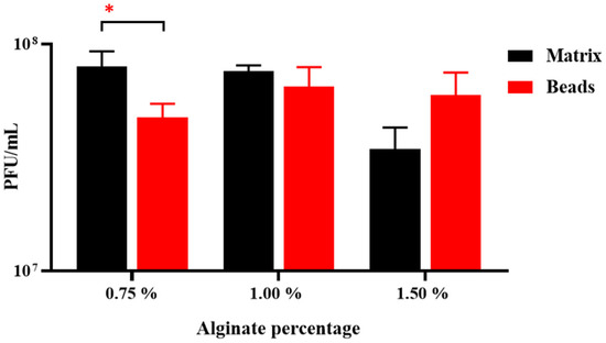 Homogeneity of the alginate matrices (0.5–1.5% w/v alginate) and quantity of phages retained in the corresponding beads. Significance is illustrated on the graphs by asterisks as follows: no asterisk = p ≥ 0.05; * = p ≤ 0.05.