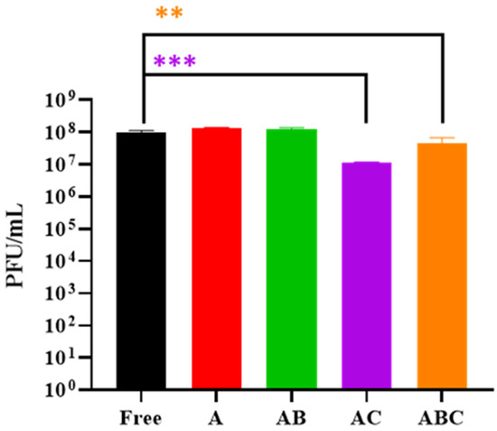 Phage titres recovered from beads treated with disruption buffer. “Free” refers to a control consisting of free phages that were used during the encapsulation process. A: Alginate beads. AB: Alginate-bicarbonate beads. AC: Alginate-chitosan beads. ABC: Alginate-bicarbonate-chitosan beads. Significance is illustrated on the graphs by asterisks as follows: no asterisk = p ≥ 0.05; ** = p ≤ 0.01; *** = p ≤ 0.001. The asterisk colour relates the significance value to the corresponding dataset.