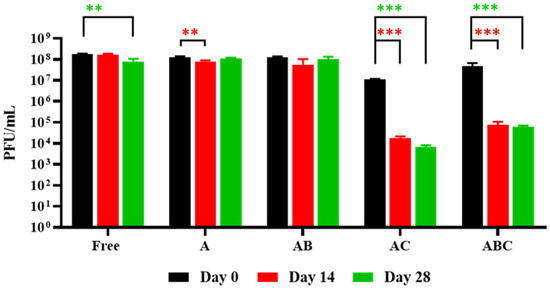 Phage retention during short-term storage. “Free” refers to a control consisting of free phages that were used during the encapsulation process. A: Alginate beads. AB: Alginate-bicarbonate (AB) beads. AC: Alginate-chitosan beads. ABC: Alginate-bicarbonate-chitosan beads. The composition of the beads affected retention as evidenced in the graph. Significance is illustrated on the graphs by asterisks as follows: no asterisk = p ≥ 0.05; ** = p ≤ 0.01; *** = p ≤ 0.001. The asterisk colour relates the significance value to the corresponding dataset.
