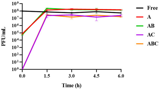 Phage release and stability in simulated intestinal fluid (SIF) over 6 h. “Free” refers to a control consisting of free phages that were used during the encapsulation process. On the x-axis, 0.0 refers to the moment the free phages or beads were added to the SIF, at which point a sample was immediately removed to determine the initial titres. A: Alginate beads. AB: Alginate-bicarbonate beads. AC: Alginate-chitosan beads. ABC: Alginate-bicarbonate-chitosan beads. The green line for the phage titres associated with the AB beads is obscured by the red line representing the titres associated with the A beads. Similarly, the orange line for the ABC beads is obscured by the purple line of the AC beads.