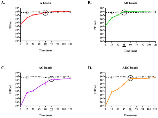 Phage release in simulated intestinal fluid (SIF) over 2 h. The moment the maximum phage titre is reached is indicated by a black circle on the graph and an underscore beneath the associated timepoint. Some error bars are obscured by the thickness of the lines. A control consisting of free phages that were used during the encapsulation process is indicated by a black dashed line in each graph. (A) Alginate (A) beads. (B) Alginate-bicarbonate (AB) beads. (C) Alginate-chitosan (AC) beads. (D) Alginate-bicarbonate-chitosan (ABC) beads.