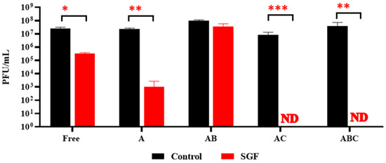 Recovery of phages following 90 min exposure to simulated gastric fluid (SGF). “Free” refers to a control consisting of free phages that were used during the encapsulation process. ND: not detected. A: Alginate beads. AB: Alginate-bicarbonate beads. AC: Alginate-chitosan beads. ABC: Alginate-bicarbonate-chitosan beads. Significance is illustrated on the graphs by asterisks as follows: no asterisk = p ≥ 0.05; * = p ≤ 0.05; ** = p ≤ 0.01; *** = p ≤ 0.001 The asterisk colour relates the significance value to the corresponding dataset.