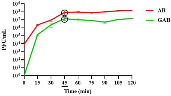 To determine the impact of low pH and proteolytic action within a simulated gastric environment on the beads, the quantity of phages retained in each type was established following exposure to SGF for 90 min (alongside a control of free phages; Figure 8). This assay revealed that the AB beads were the only variety not significantly affected by the SGF (i.e., p ≥ 0.05). Meanwhile, the free phages were reduced by 1.88 log, the phages retained in the A beads were reduced by 4.36 log, and no phages were recovered from the AC or ABC beads (Figure 8). Based on this observation, it was decided to limit further investigations to include only the AB beads, as this clearly was the most robust formulation. The AB beads pre-exposed to SGF (GAB) were also capable of releasing viable phages into SIF, with the maximum phage load released at 45 min, in parallel with the untreated AB beads (Figure 9). The reduced viral load of the GAB is presumed to be an effect of the SGF pretreatment.